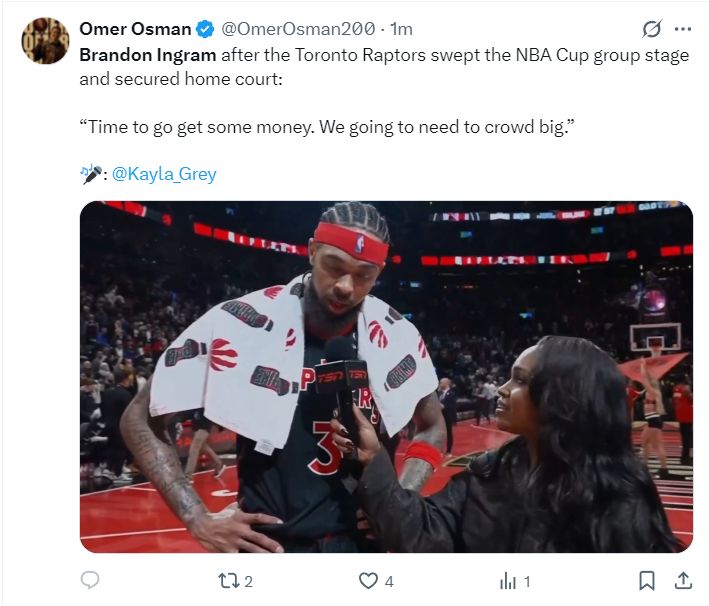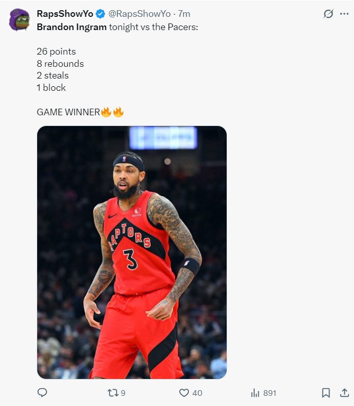 此役英格拉姆全场比赛38分钟,23中11,三分4中1,罚球5中3,拿到26分8篮板0助攻2抢断1盖帽,命中率47.8%,三分命中率25%,英格拉姆连续两场比赛25+,过去9场比赛英格拉姆拿到6场20+与三场25+。