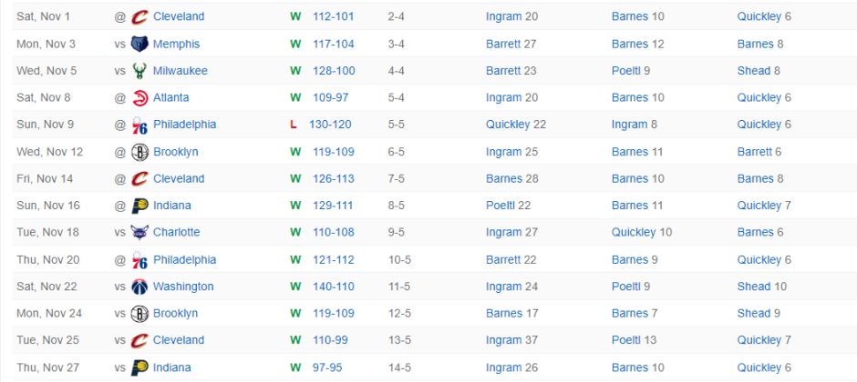 自11月1日以来猛龙取得了14战13胜的傲人战绩,目前是一波9连胜+杯赛四连胜,猛龙的战绩仅次于活塞。