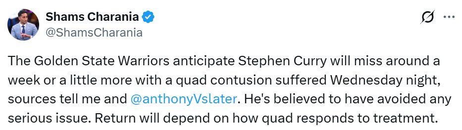 至少一周的缺阵意味着他至少缺席3场比赛——勇士队将于周日迎战鹈鹕队、周三对阵雷霆队,随后在下周五开启客场之旅,首战76人队。