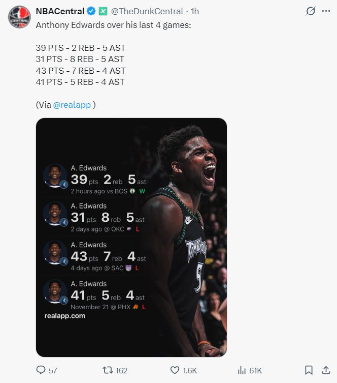 过去的四场比赛爱德华兹分别拿到39+5+2、31+8+5、43+7+4、41+5+4,但森林狼只拿到1场胜利,兰德尔本赛季的状态稳定性极差,他都算不上球队的第二巨头了。