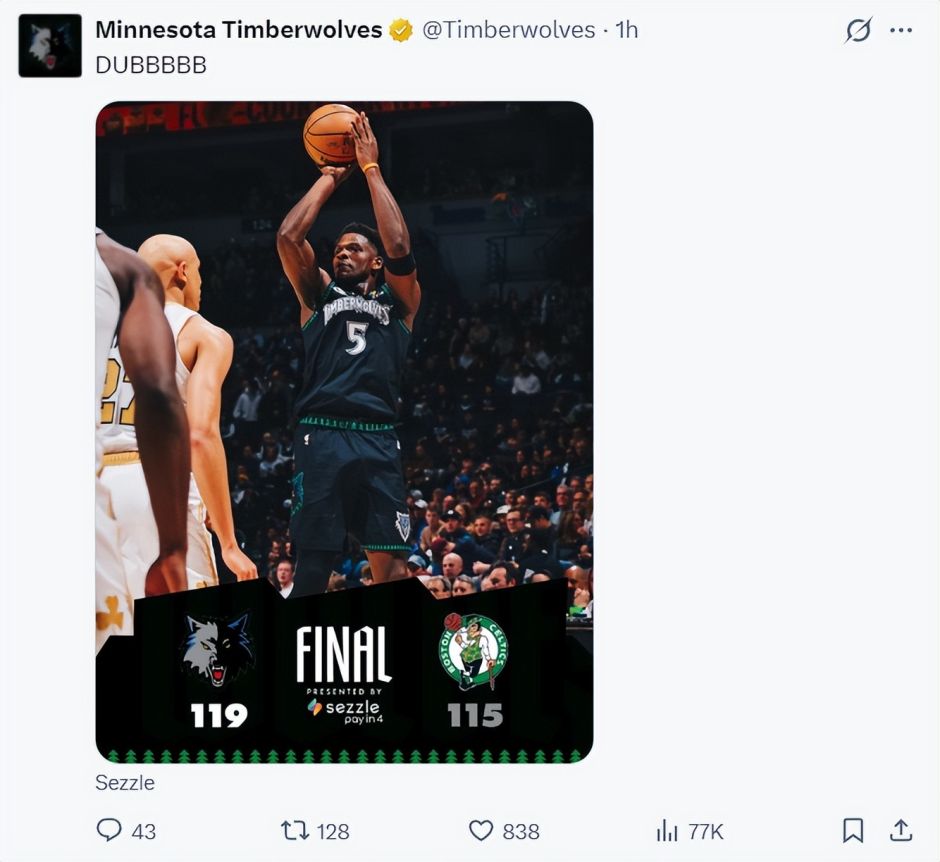 北京时间11月30日,森林狼119-115险胜凯尔特人结束漫长的三连败。这场比赛森林狼在客场是逆转取胜,森林狼一度落后绿凯12分之多,在第三节追回失分,末节进入决胜时刻华子完成神之一手三分锁定胜局。