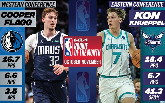 独行侠的弗拉格和黄蜂的克努佩尔分别当选联盟10-11月西部和东部赛区最佳新秀。