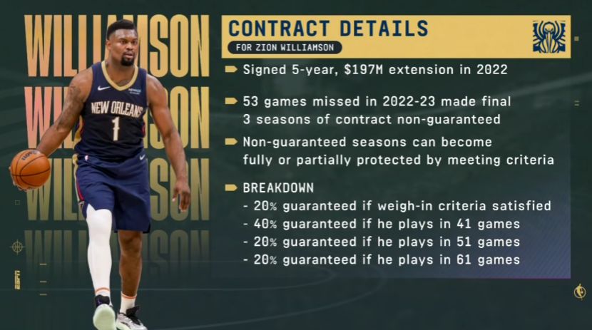 薪金专家马克斯表示:“锡安的合同是我们见过的最特殊的新秀顶薪续约合同之一。他的合同还剩三年,本赛季约4000万美元的薪资是受保障的,但剩余两个赛季的薪资均无保障,且都设有7月15日的保障触发日期。所以对于有意引进锡安的球队来说,只要不必付出高价值筹码,交易得到他其实没什么风险。这份合同很特殊,就像我刚才说的,要是不用牺牲选秀权和队内核心球员,引进他算得上是低风险操作。”