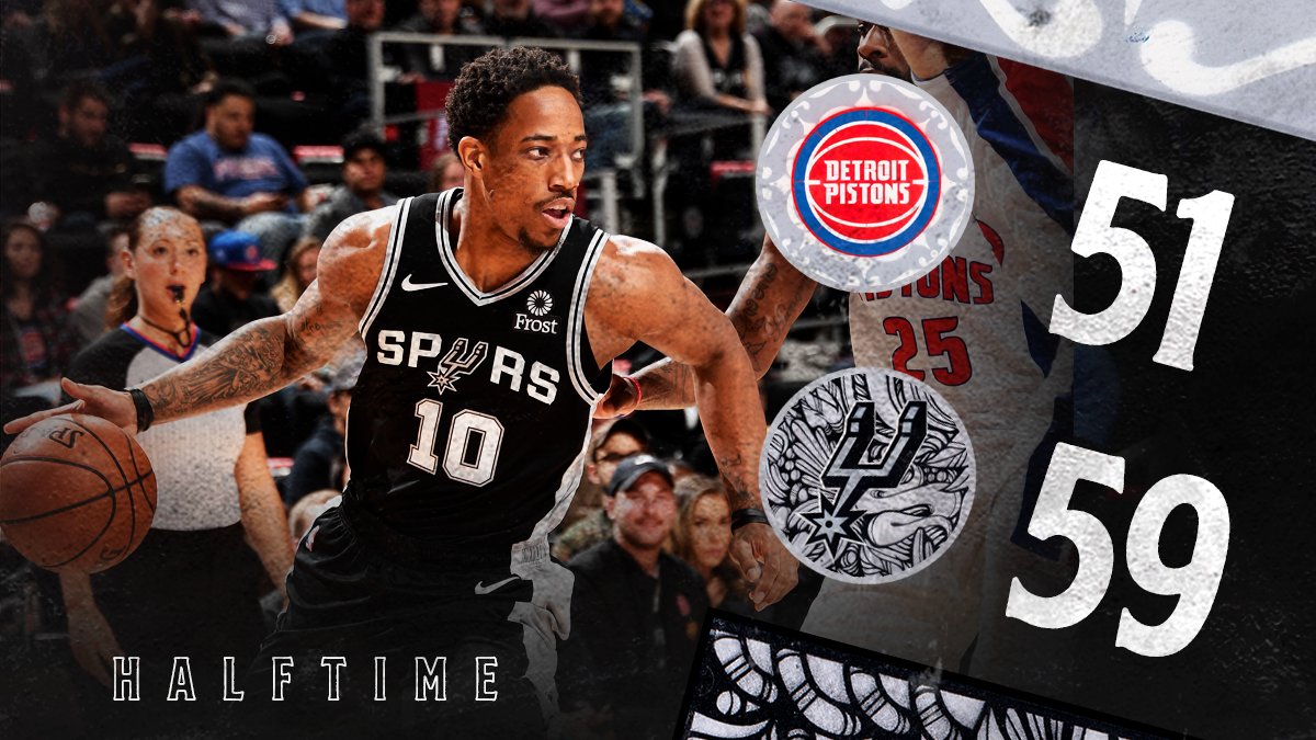 上半场比赛结束,马刺客场59-51领先活塞。德罗赞11分4助攻2盖帽,阿德、怀特、米尔斯各9分,贝里内利7分,福布斯5分,贝尔坦斯5分5助攻,半场已经破了自己单场的NBA助攻纪录,珀尔特尔、加索尔各2分。