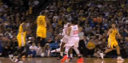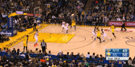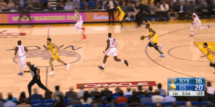 半场结束前,第二节还剩5秒时,库里弧顶借掩护向右侧突破,汤神同时借助追梦格林的掩护摆脱防守来到右侧45度,正好接到库里的传球三分命中。这一球打进之后,勇士将半场的领先优势扩大到12分。半场打完,汤神就轰下了17分。