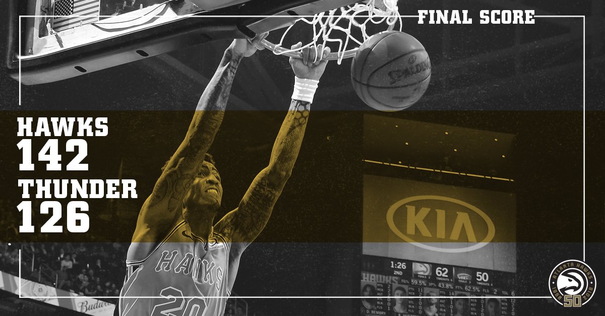 最后12分钟的争夺,第三节状态还非常出色的雷霆末节突然哑火,第三节单节轰下41分的他们这一节前6分30秒里仅得到9分,老鹰则彻底起势,特雷-杨开局率先命中三分,随后反击打成2+1,老鹰开局先用进攻抵挡住雷霆的三板斧,随后面对彻底哑火的雷霆,他们开启了疯狂的进攻,科林斯打成2+1,随后连续拼抢到进攻篮板完成补篮,加上斯佩尔曼的三分和暴扣,老鹰送出一波24-8的攻势一举反超并建立起12分的领先。暂停归来老鹰彻底接管比赛,本布里和特雷-杨的两记三分杀人诛心帮助老鹰牢牢掌控局面。乔治的三分虽然帮助雷霆将分差缩小至9分,但此时时间所剩无几,老鹰很快打出反击重新拉开比分。最终,老鹰142-126击退雷霆拿下比赛。
