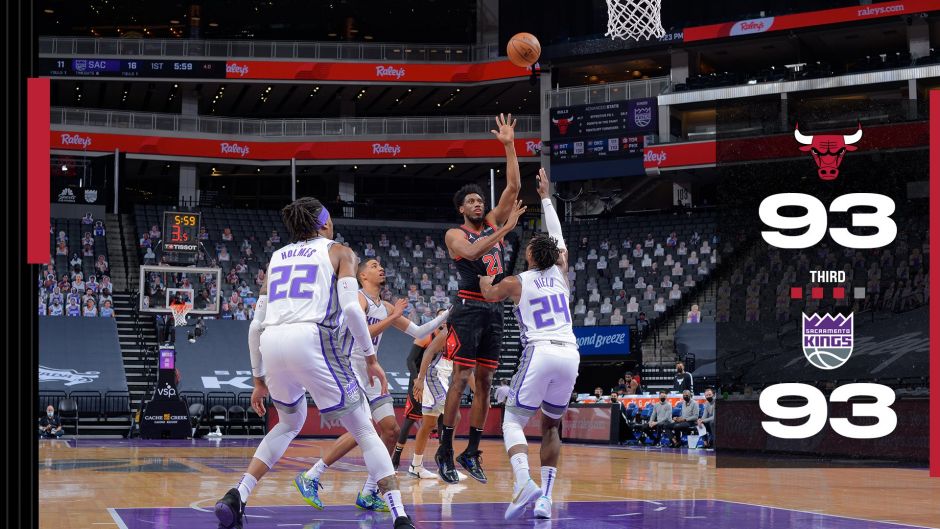 第三节比赛,国王这边巴恩斯突破率先拿分,拉文则在反击中远投得分,这波对决中国王一直稳住微弱领先,巴格利的两记三分带队掀起进攻,节中这一波12-5的攻势拉开比分。然而末段公牛又一次追上比分,坦普尔命中止血三分,加上赛迪斯-杨连续禁区拿分,刚刚拉大至9分的劣势很快就被追上。末段进攻公牛依靠怀特连续拿分实现反超,不过别利察两罚全中追平比分。
