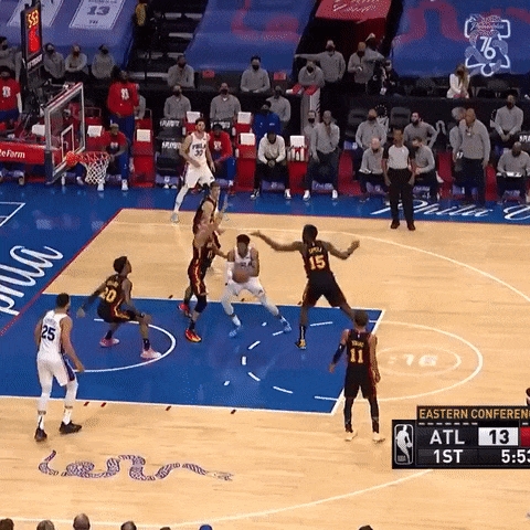 首节比赛进行至剩余五分钟,哈里斯拿球背打,奈何进攻无效,只好传球给西蒙斯,西蒙斯加速上篮,结果被拦截,再次进攻无效,只得以将球传给外线恩比德,恩比德一记假投真突转身后仰,晃开对手,成功斩获两分。