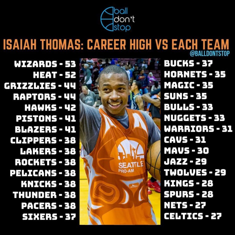 球迷屋9月20日讯,根据美媒balldontstop社交ins晒图,晒出自由球员以赛亚-托马斯生涯面对各个球队的最高分统计图。