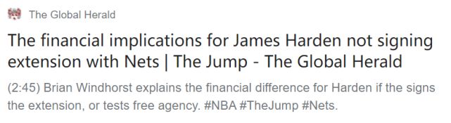 哈登表态自己愿意长留布鲁克林,但直到现在,他还没在合同上签字。哈登为什么仍未与篮网续约?ESPN两大专家帕金斯和文霍斯特在最新一期的The Jump节目上进行解析。他们认为,除了哈登自己说的专注于夺冠,主要还有两个方面原因:一个是金钱上的差别,另一个则和欧文相关。