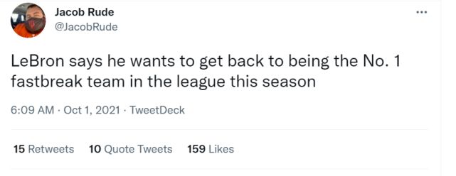 北京时间10月1日,湖人训练营,詹姆斯在采访中强调快攻的重要性。“我们想要回到快攻第一的位置。我觉得我们这个赛季的阵容,最强的能力就是可以跑起来。显然,拉斯一直是联盟前五的节奏,这一点可以成为我们的优势,有利于我们的整体进攻。”
