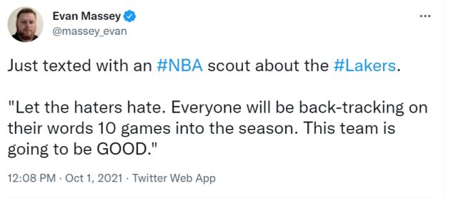NBA记者Evan Massey在社媒上透露,一个NBA球探刚刚在短信里对他说“让黑子们黑吧。新赛季打了10场球后,每一个人都会收回他们的话。这支球队将会表现得很出色。”