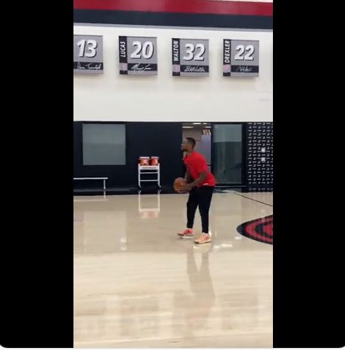 球迷屋10月2日讯,近日,开拓者训练营已经开始,利拉德在训练营展现超远三分投射能力。