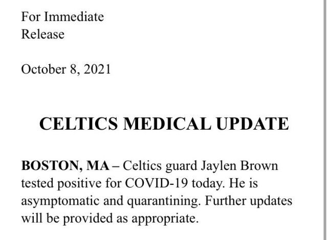 北京时间10月9日,凯尔特人官方宣布,杰伦-布朗新冠检测呈阳性,目前已经隔离,他暂未出现相关症状,球队将在合适时候更新进展。凯尔特人还表示,布朗因健康安全协议将缺席明天对猛龙的季前赛。